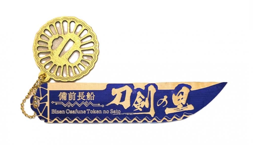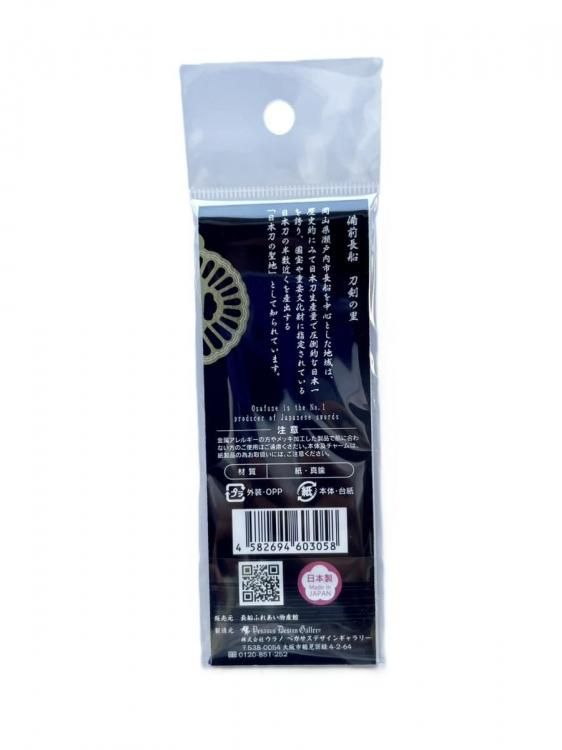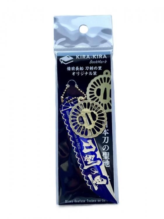 深みのある濃い青色の栞本体は、静謐で力強い刀身をイメージしており、輝きを放つ金色のチャームは菊花透鐔デザインです。